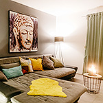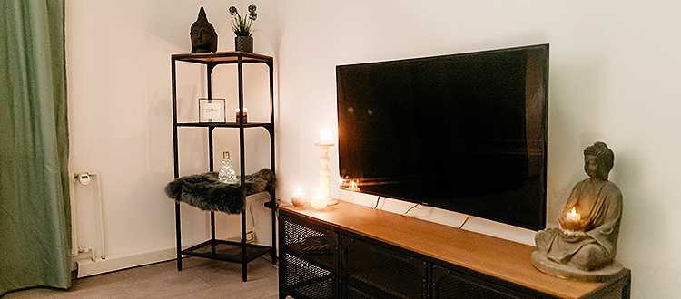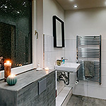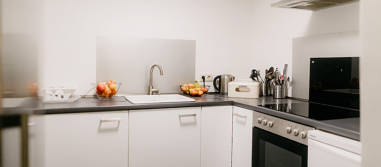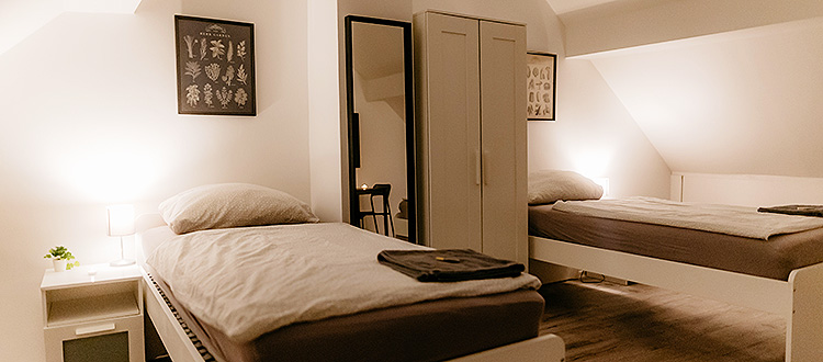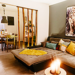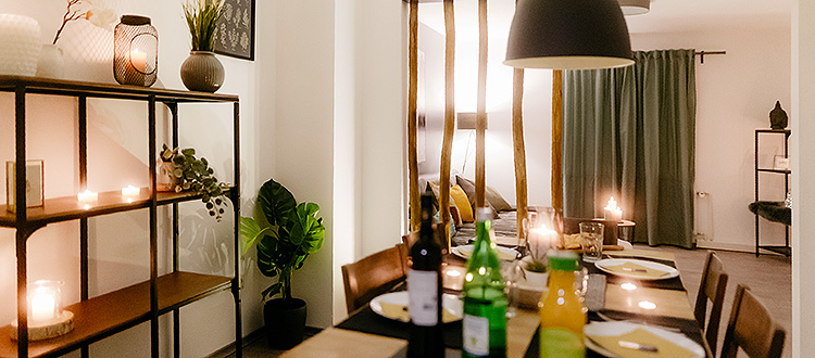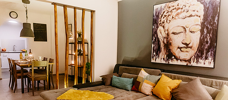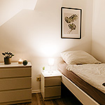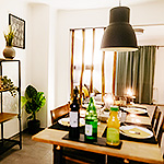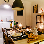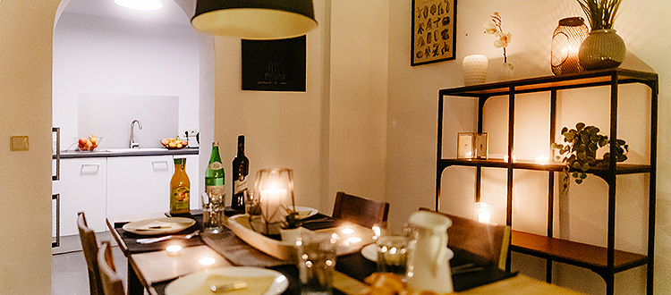 In total, we can welcome up to five persons to the flat. The labyrinthine structure of the apartment creates a charming atmosphere. A big living room with a dining table and an open kitchen are the perfect places for a cozy come-together.